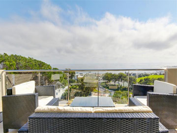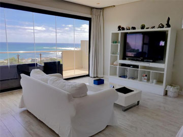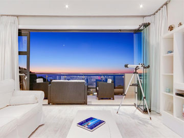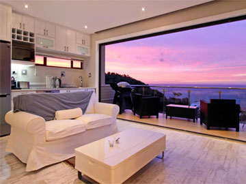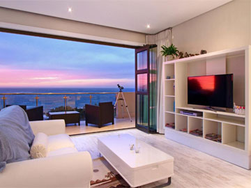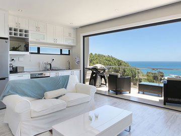 TV is a Smart 55 inch plasma TV. The kitchen is fully equipped with large fridge, oven and hob, and many other amenities. Comfortably furnished, with an open plan lounge and dining room that slides open onto a patio overlooking the sea with garden and pool area below.