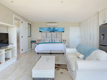 It sleeps two and features a large bedroom with extra length king size bed, separate bathroom with a large shower overlooking the sea and bath, couch, coffee table that converts to a dining table and outside furniture.